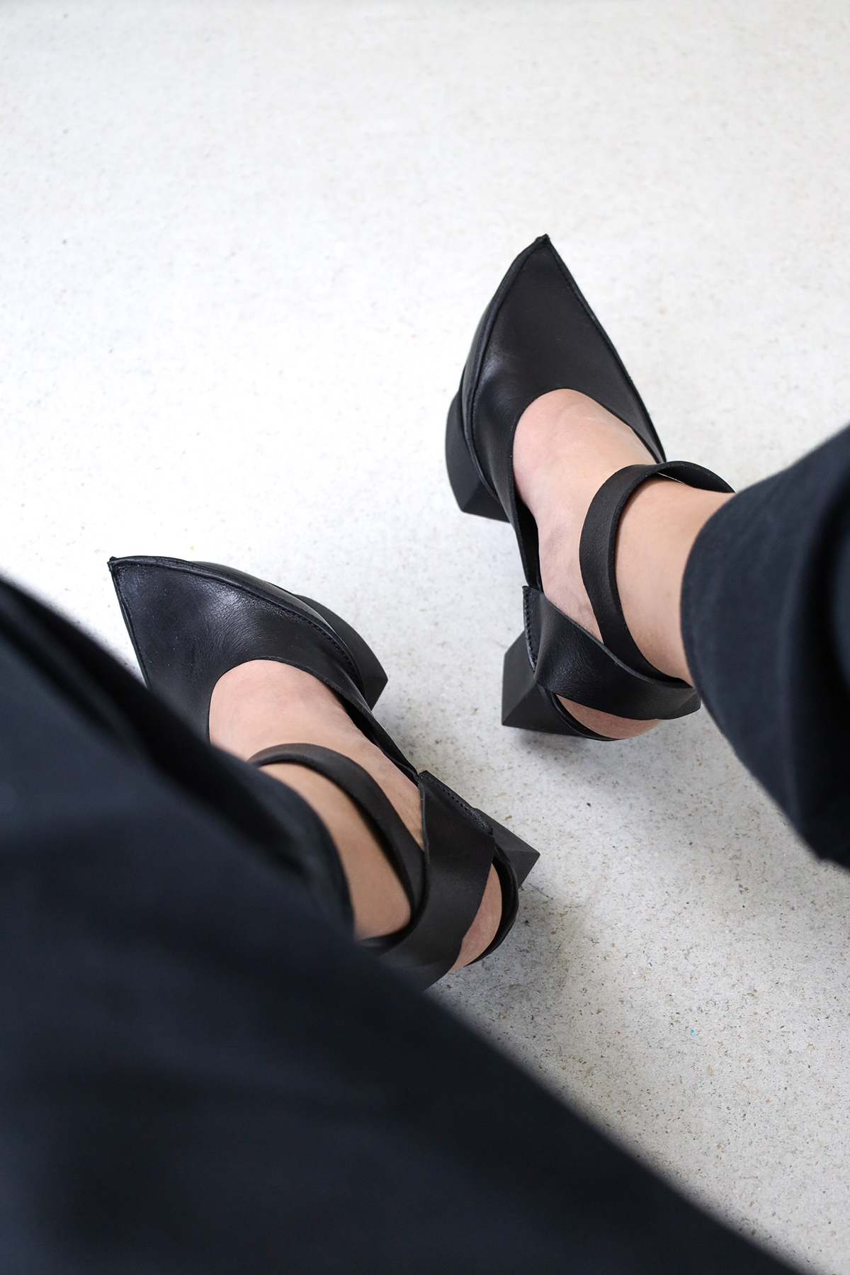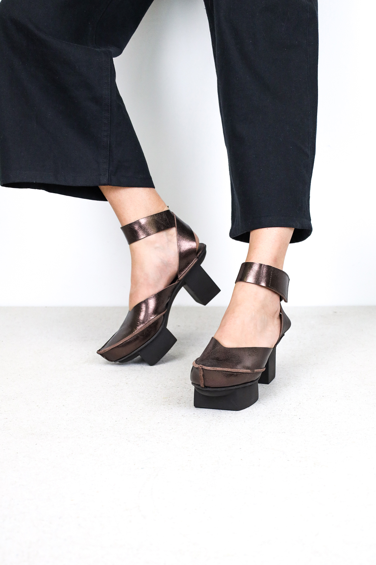 Eine gotische Spitze hält den Vorfuss, während die Fesselriemen über der Ferse gekreuzt und mit einem Klettverschluss geschlossen werden.