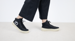 Unisex High Top Sneaker aus 98% abbaubarem Material. Die Naturkautschuksohle ist aus drei Schichten aufgebaut und doppelt vernäht. Das Upper wird aus alten belgischen Leinenpostsäcken, Militärzeltplanen oder Post-consumer Jeans gearbeitet.