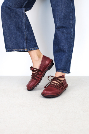 Ballerina aus weichem Leder mit einem umlaufendem festen Lederrand. Durch die Gummizugschnürung entsteht eine geometrische Einheit, die den Fuß flexibel festhält.