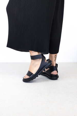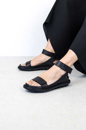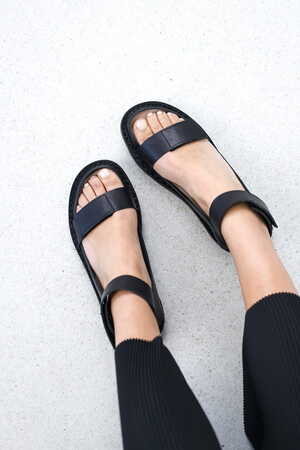 Minimalistische, über dem Fuß weit offene, dynamisch um den Knöchel geschwungene Sandale. Der schmale Rand umschließt den Fuß und sorgt zusammen mit den beiden breiten Klettverschlussriemen für sicheren Halt.
