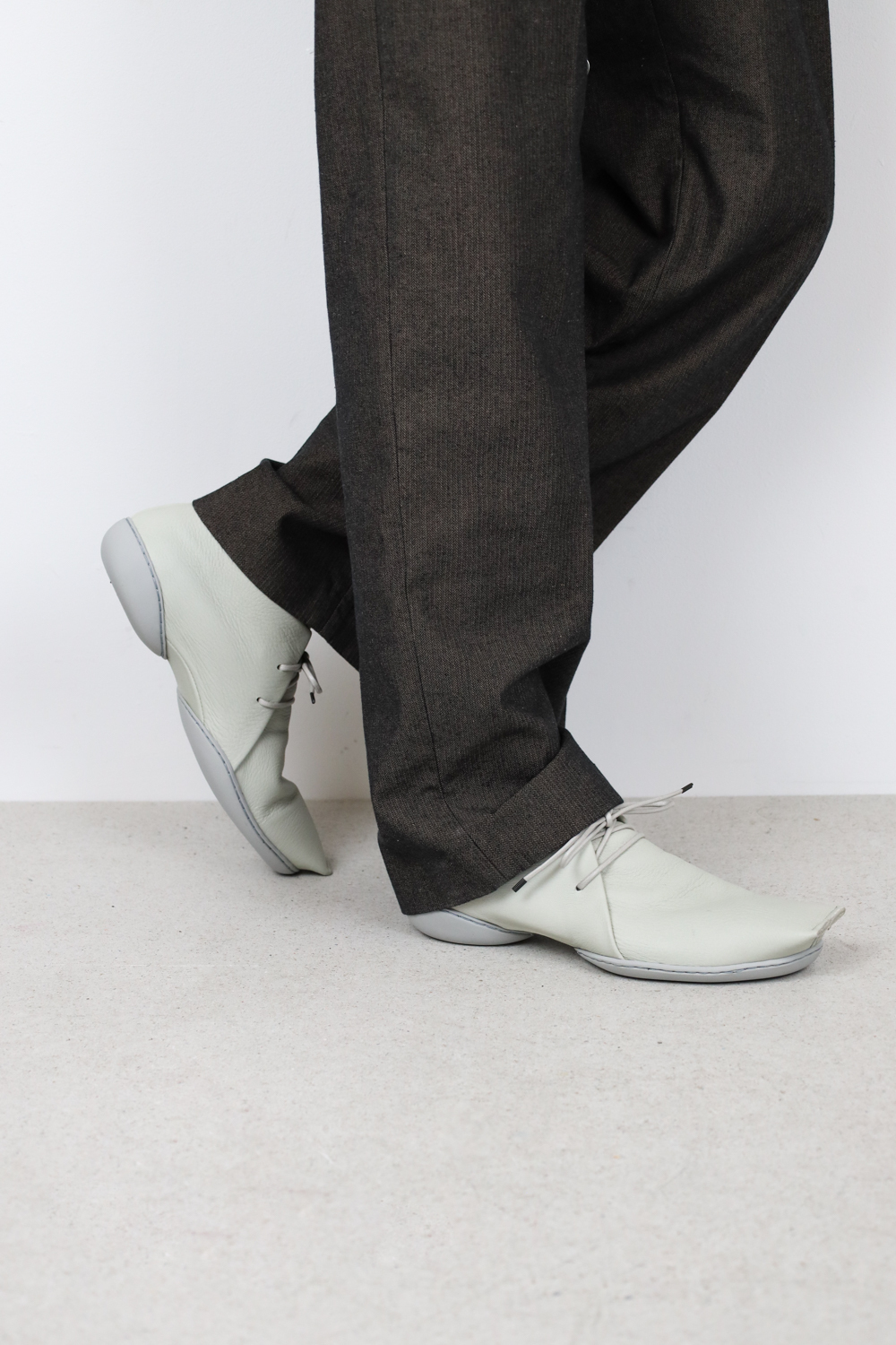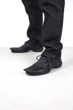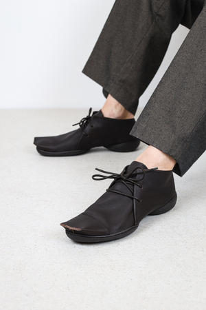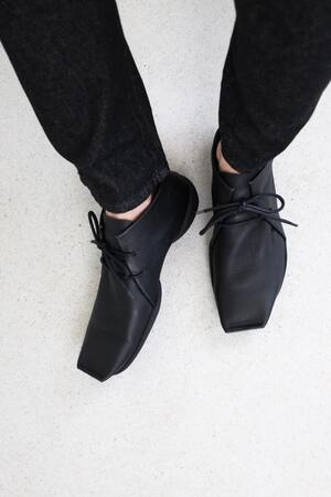 Gerade, geometrische Formen und eine wie abgeschnitten wirkende Karreespitze kontrastieren bei diesem Schnürschuh mit dem weichen Leder.