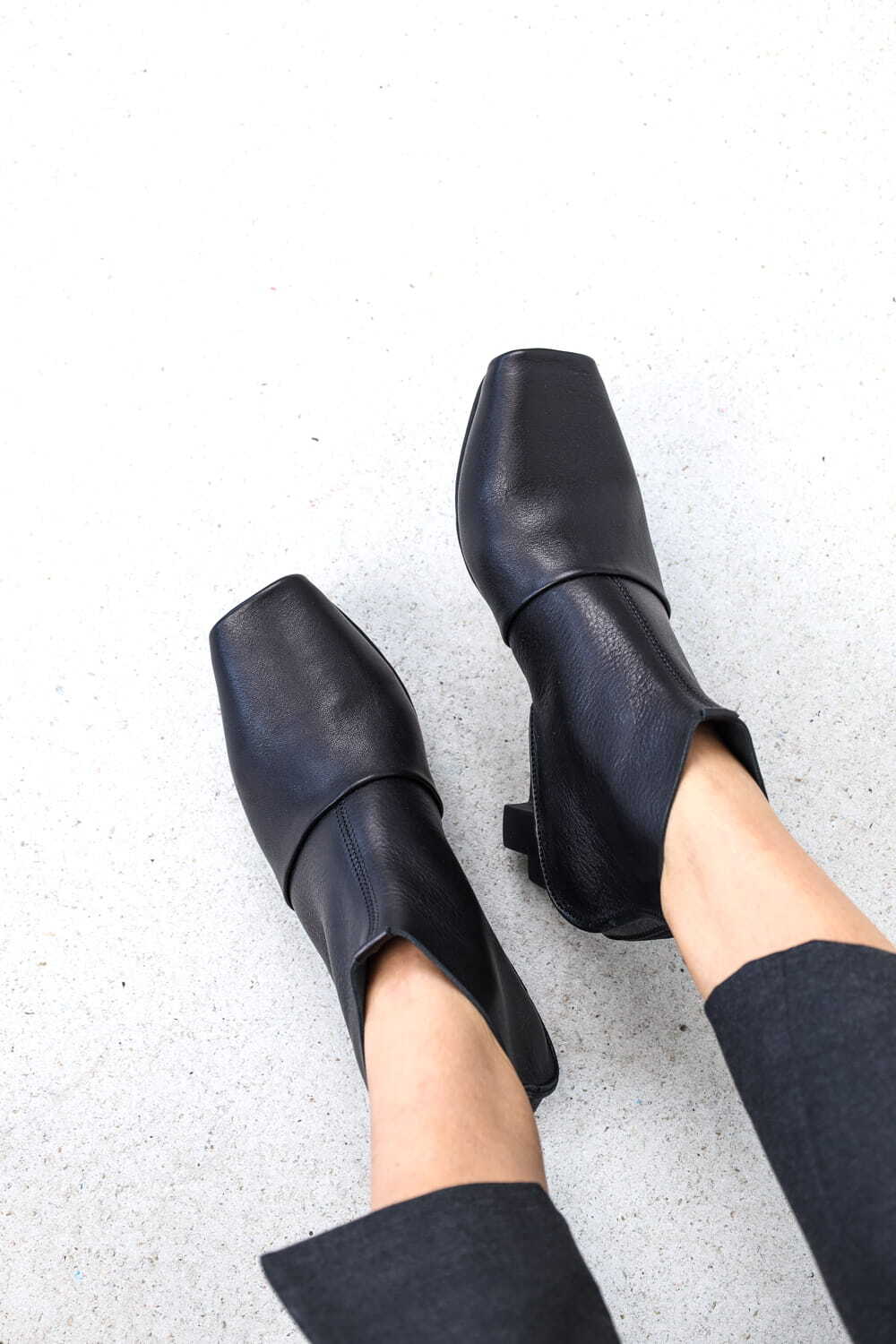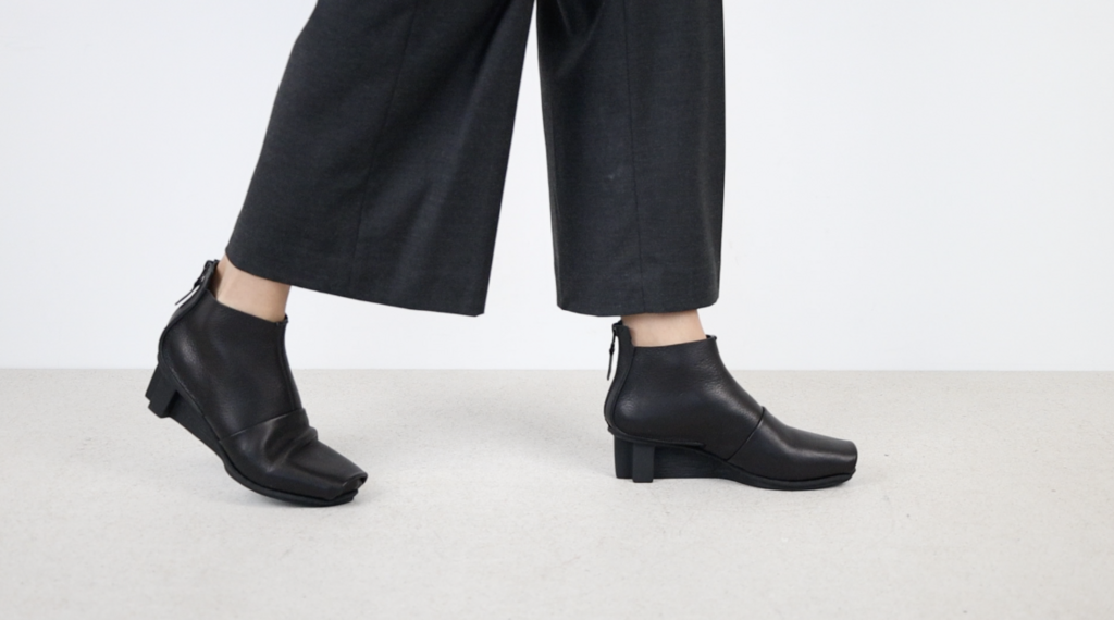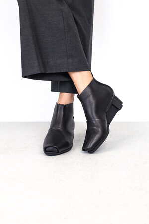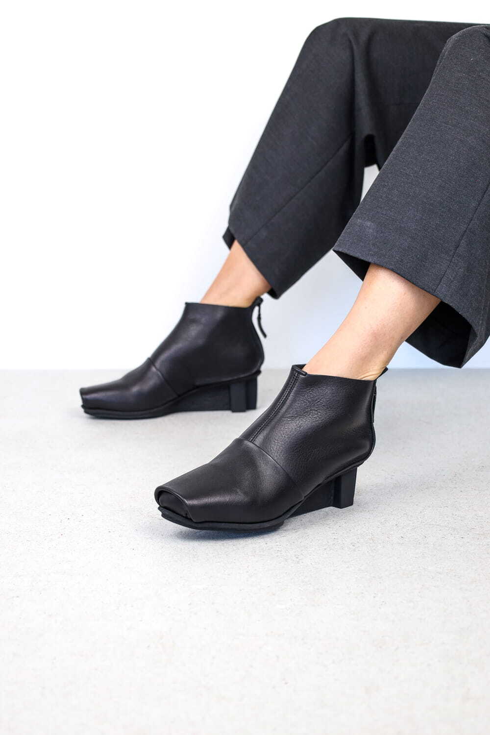 Ankle Boot mit einer aus einer Falte entwickelten Spitze, die mit einem eingefassten Reißverschluss bequem geschlossen werden kann.