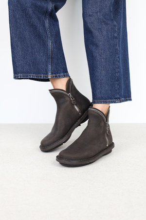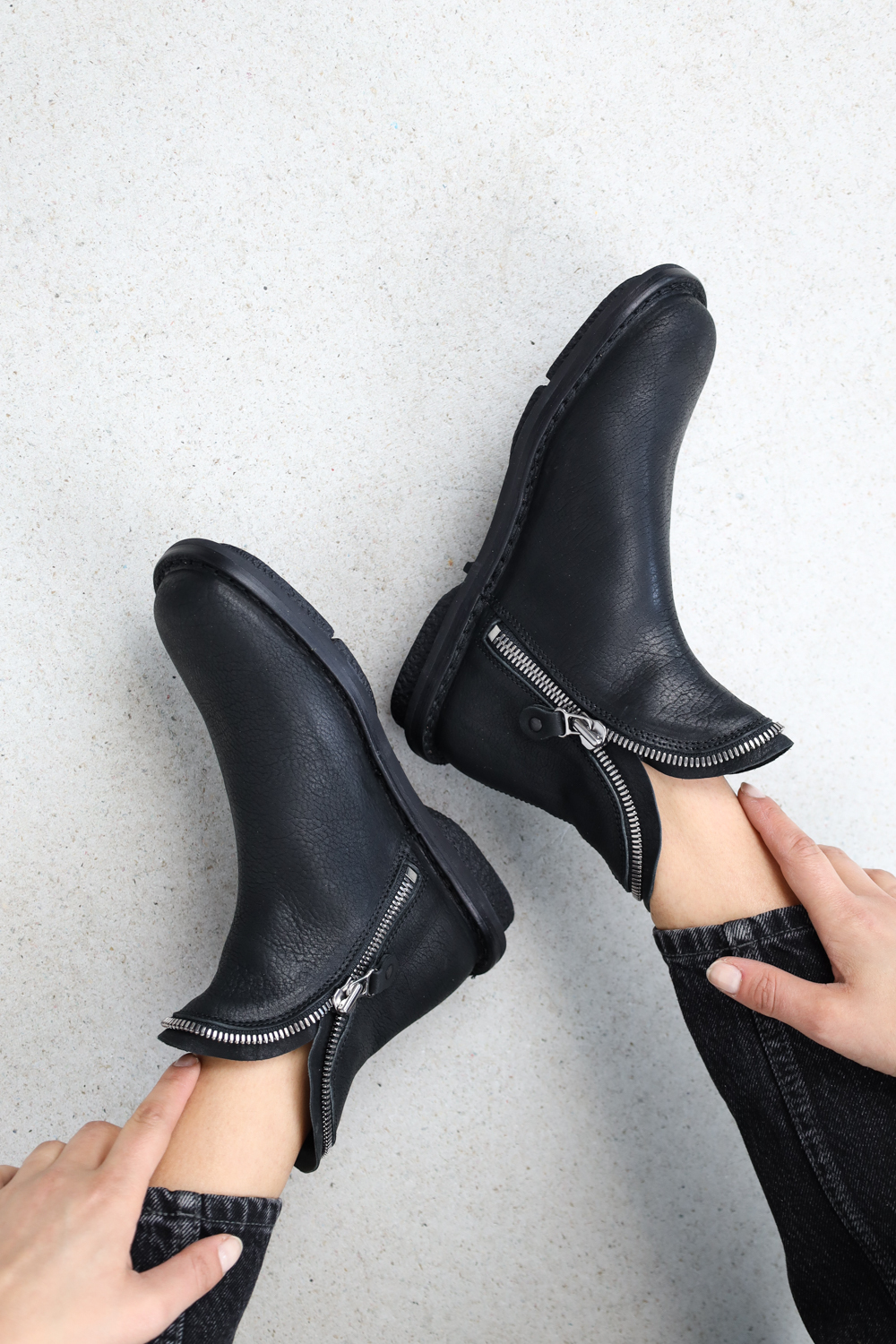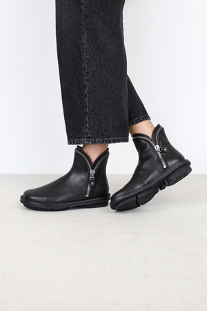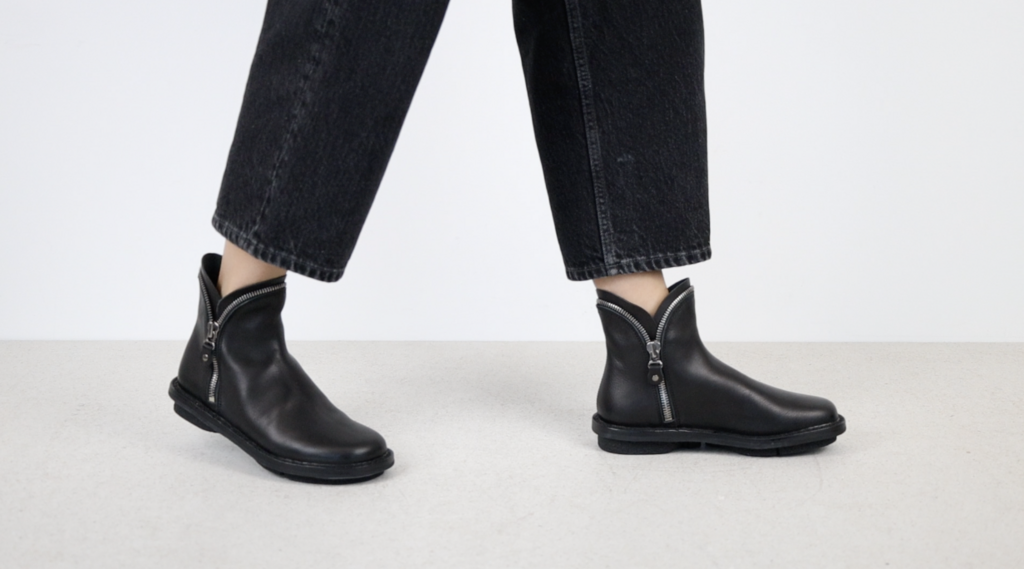Die beiden nahtlosen Schaftteile sind allein durch zwei Reißverschlüsse innen und außen miteinander verbunden. Oberhalb des Knöchels teilen sich die Reißverschlüsse so, dass sie als dekoratives Element um den Schaftabschluss verlaufen.