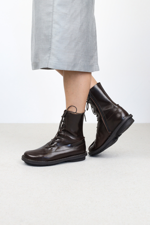 Asymmetrisch verschwindet die Schnürung dieses Stiefels in einer Überlappung, die von der Spitze über den Spann um die Ferse bis zum Reißverschluss auf der Innenseite geführt wird.