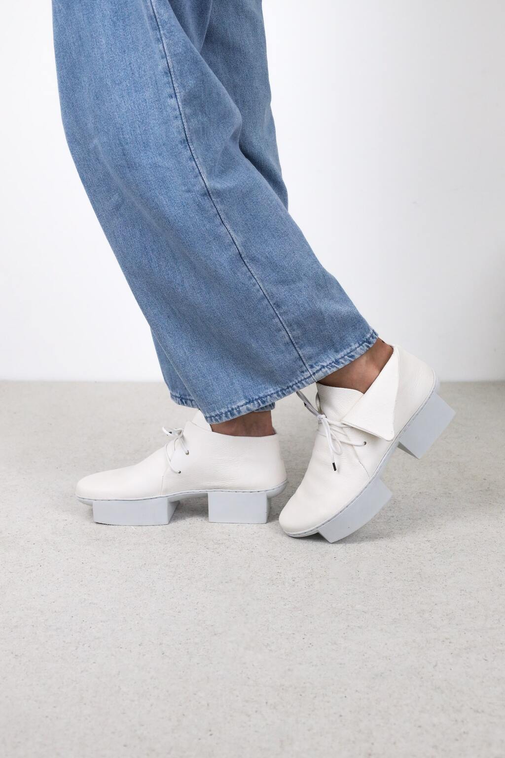 Bei diesem weichen Halbschuh bilden gerade, geometrische Formen ein asymmetrisches und außen umgefaltetes Schnürelement.