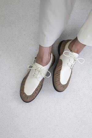 Fein gerafftes Leder spielt bei diesem Schnürschuh mit den klassischen Broguelinien.