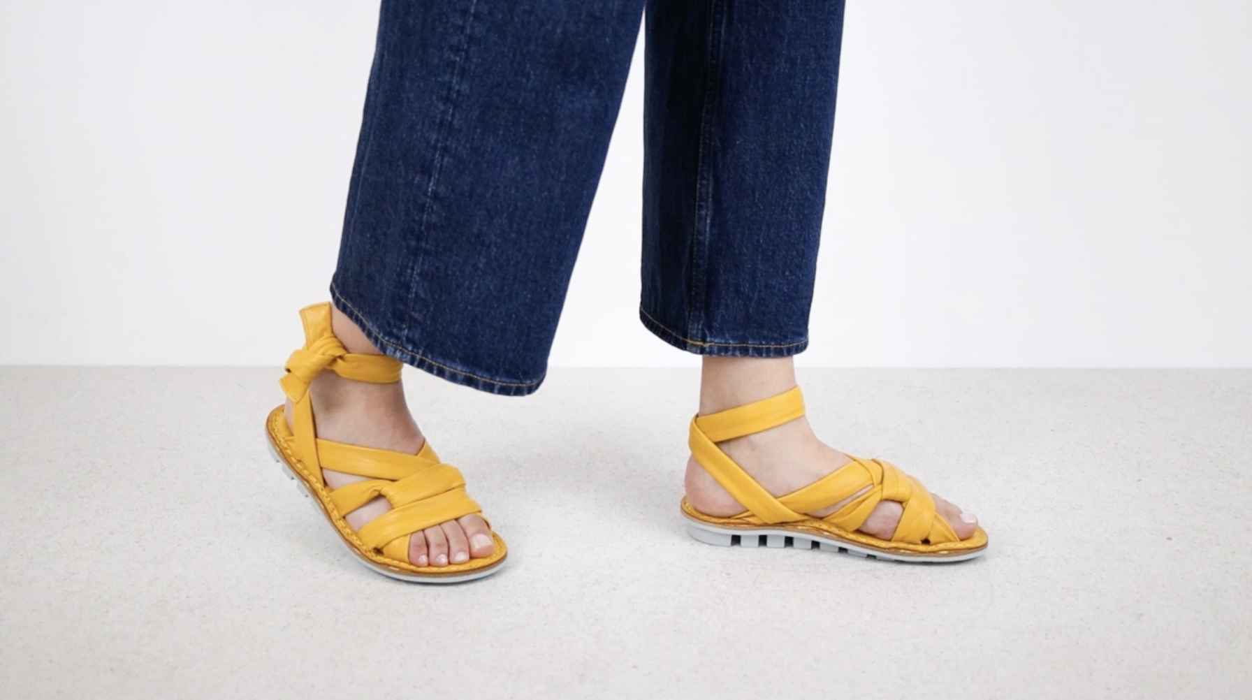Weiche, elegante Sandale mit ineinander verschlungenen Riemen, die eine verspielte Formation über dem Rist bilden und um den Köchel geknotet werden.