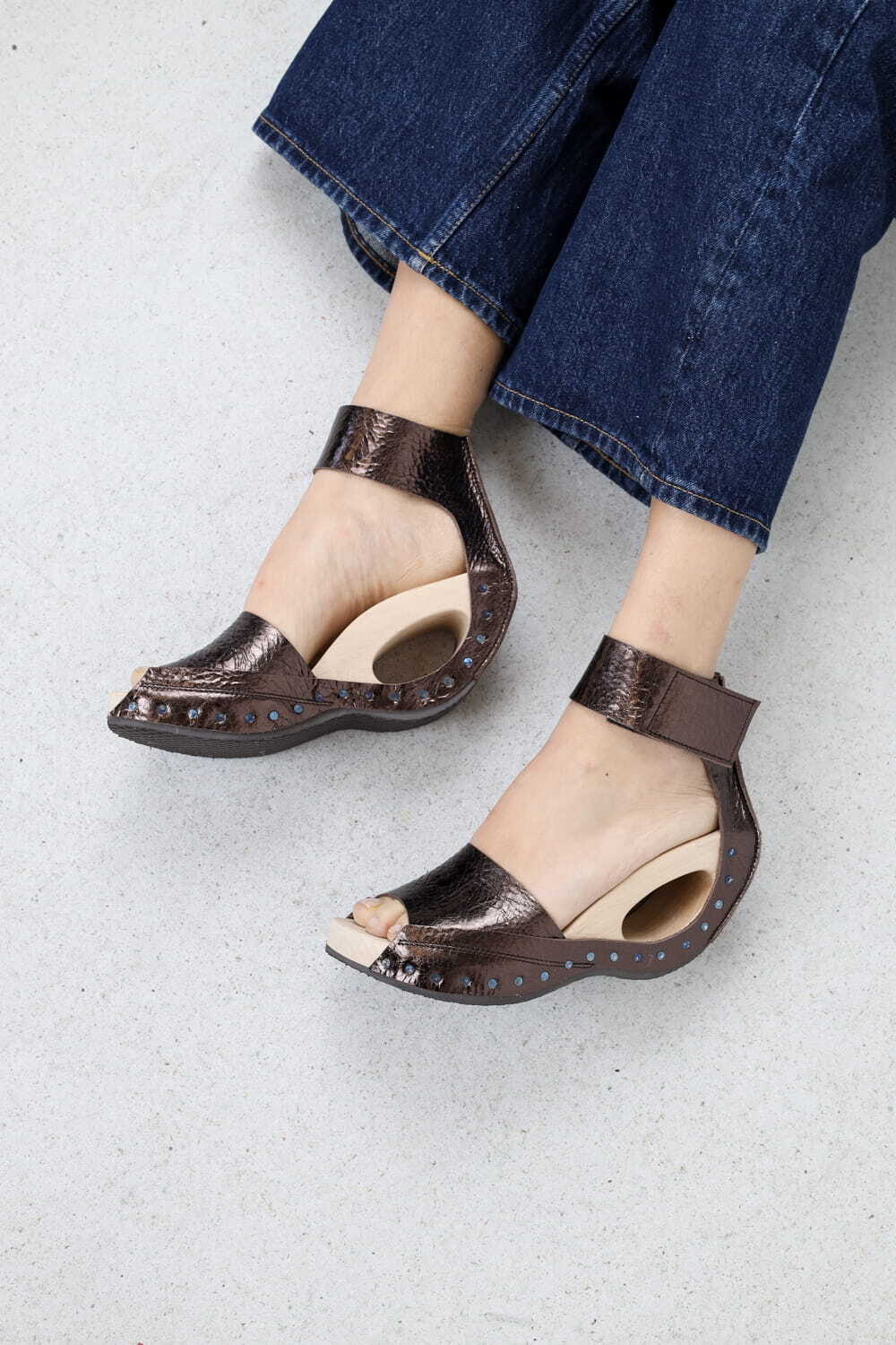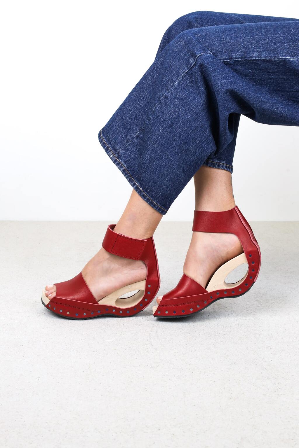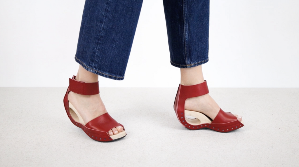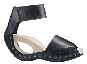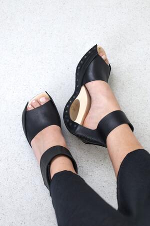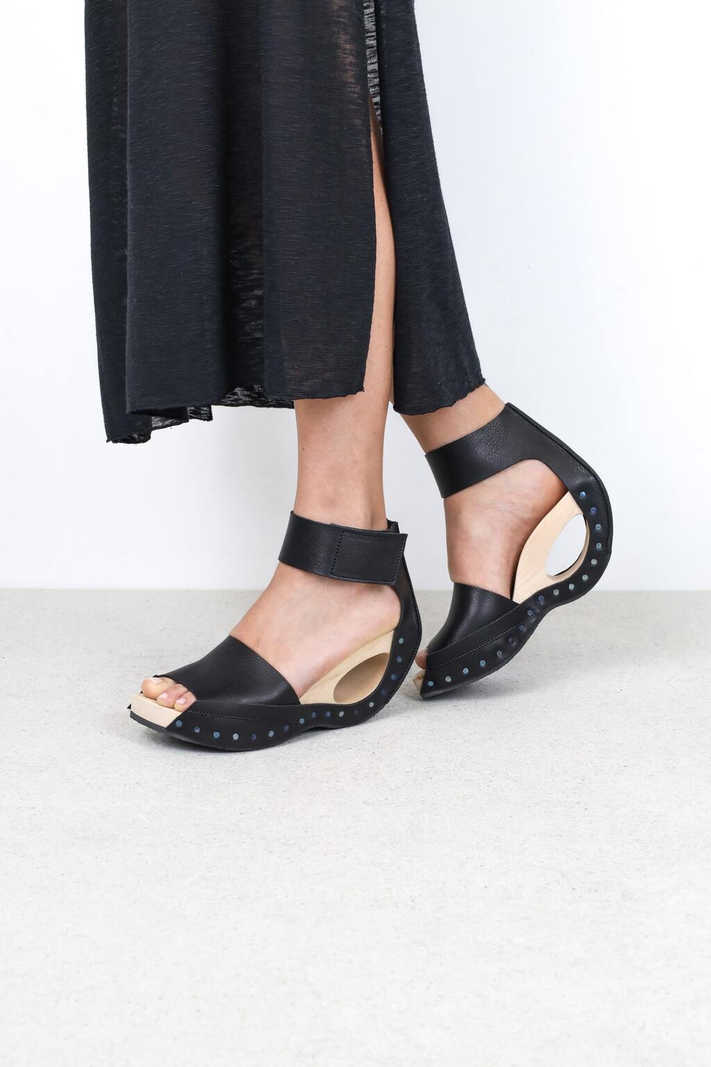 Vom Riemen über dem Ballen wird das Leder dieser eleganten Holzsandale unter dem markanten Loch im Absatz über die Absatzlinie in einen Fesselriemen geführt.