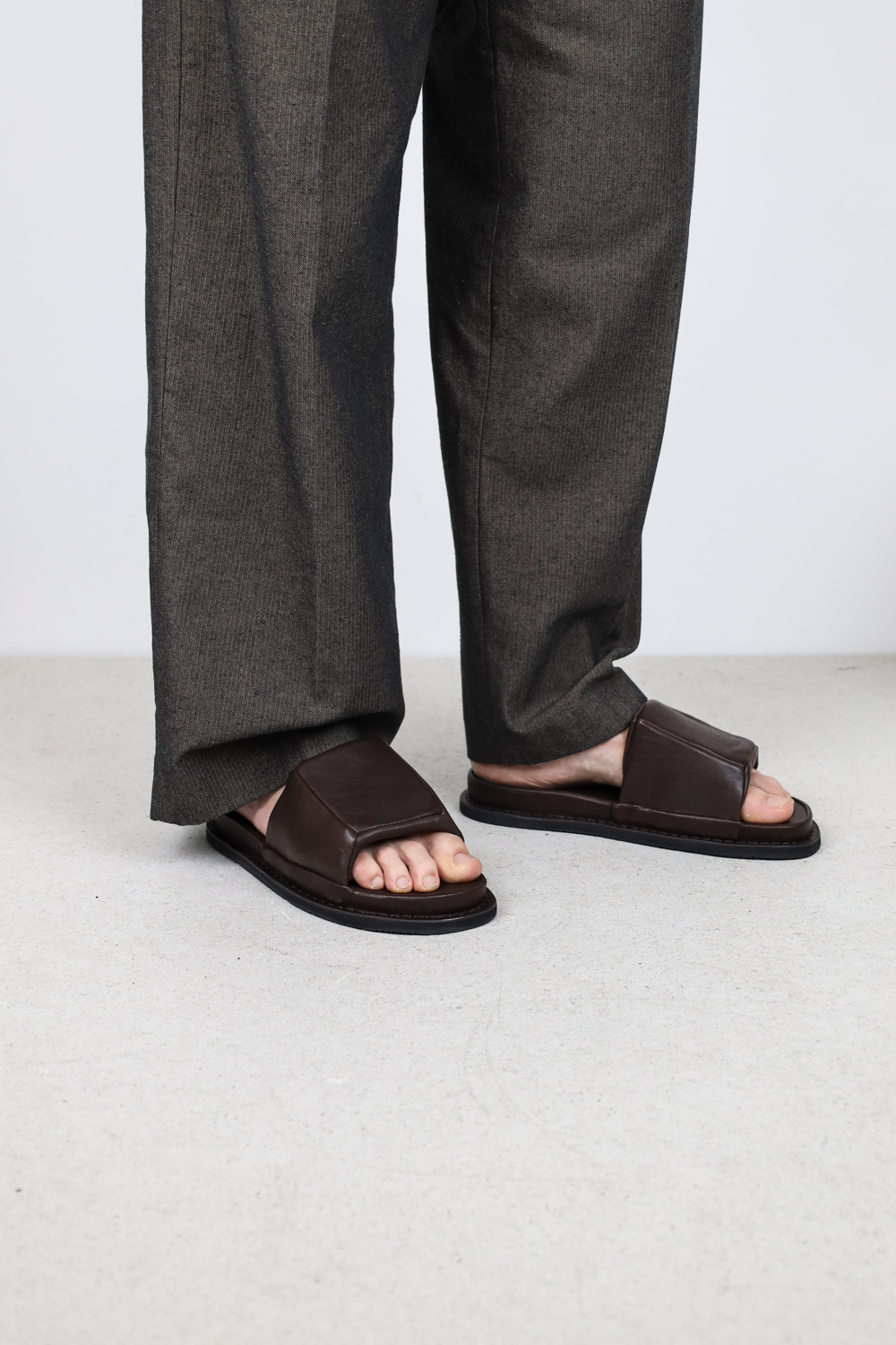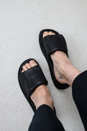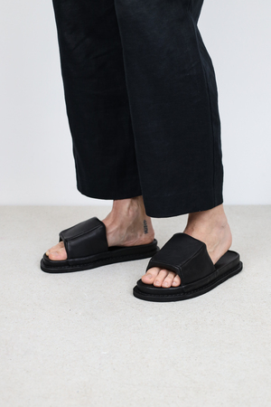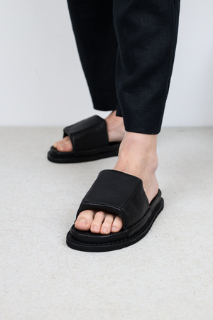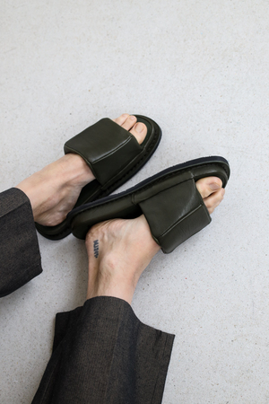 Ein Unisex-Slipper, bei dem der Fuß sanft von einem luftigen, architektonischen Kissen umgeben ist.