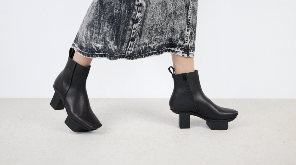 Die Carréspitze aus einer geschickten Schnitt- und Falttechnik spielt mit der Kubatur der Happy Sohle, der aufgesetzte Streifen nimmt dezent Kontakt mit der Clubkultur auf.