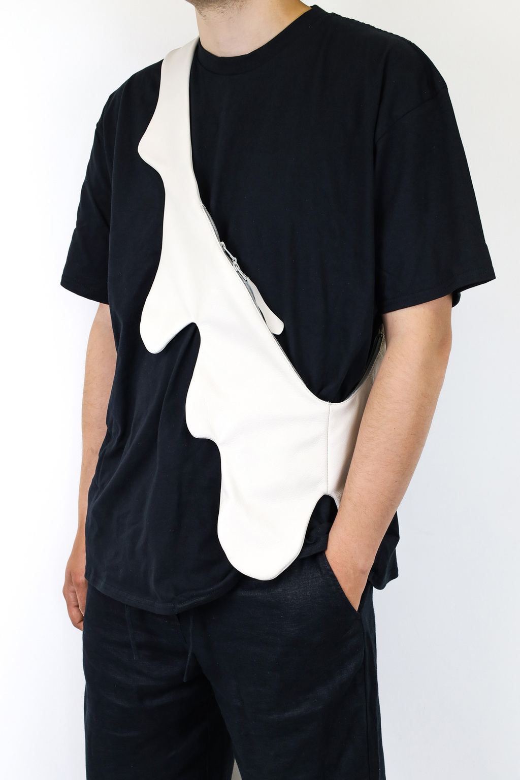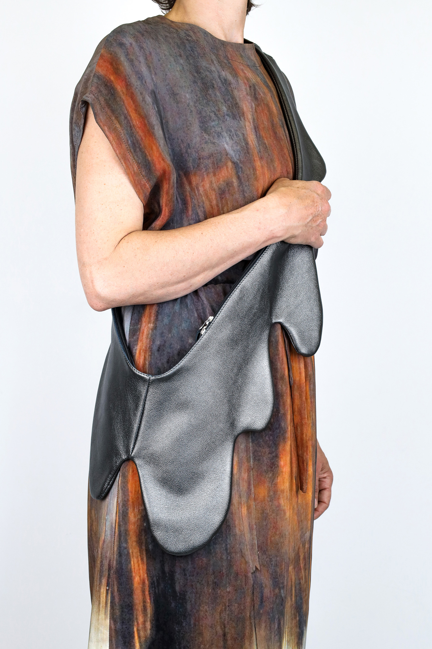 Weiche, schlanke Umhängetasche mit kaskadenförmigen Linien, die gleichzeitig als mehrere kleine Taschen dienen. Sie schmiegt sich elegant an den Körper an und macht jedes Oberteil zu einem Statement-Stück.