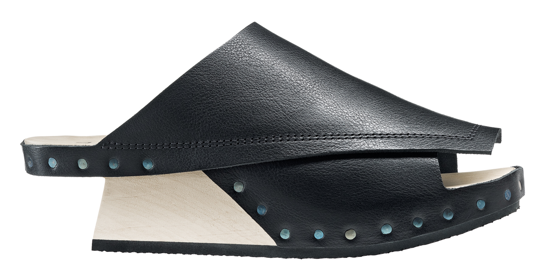 Holzclog mit ausgeschnittenem Absatz, dessen Lederschichten sich komplex in grafischen Formen an Fuss und Sohle überschneiden.