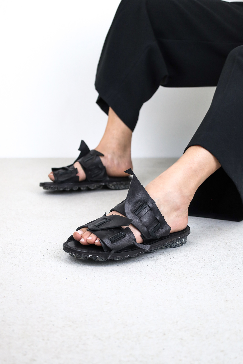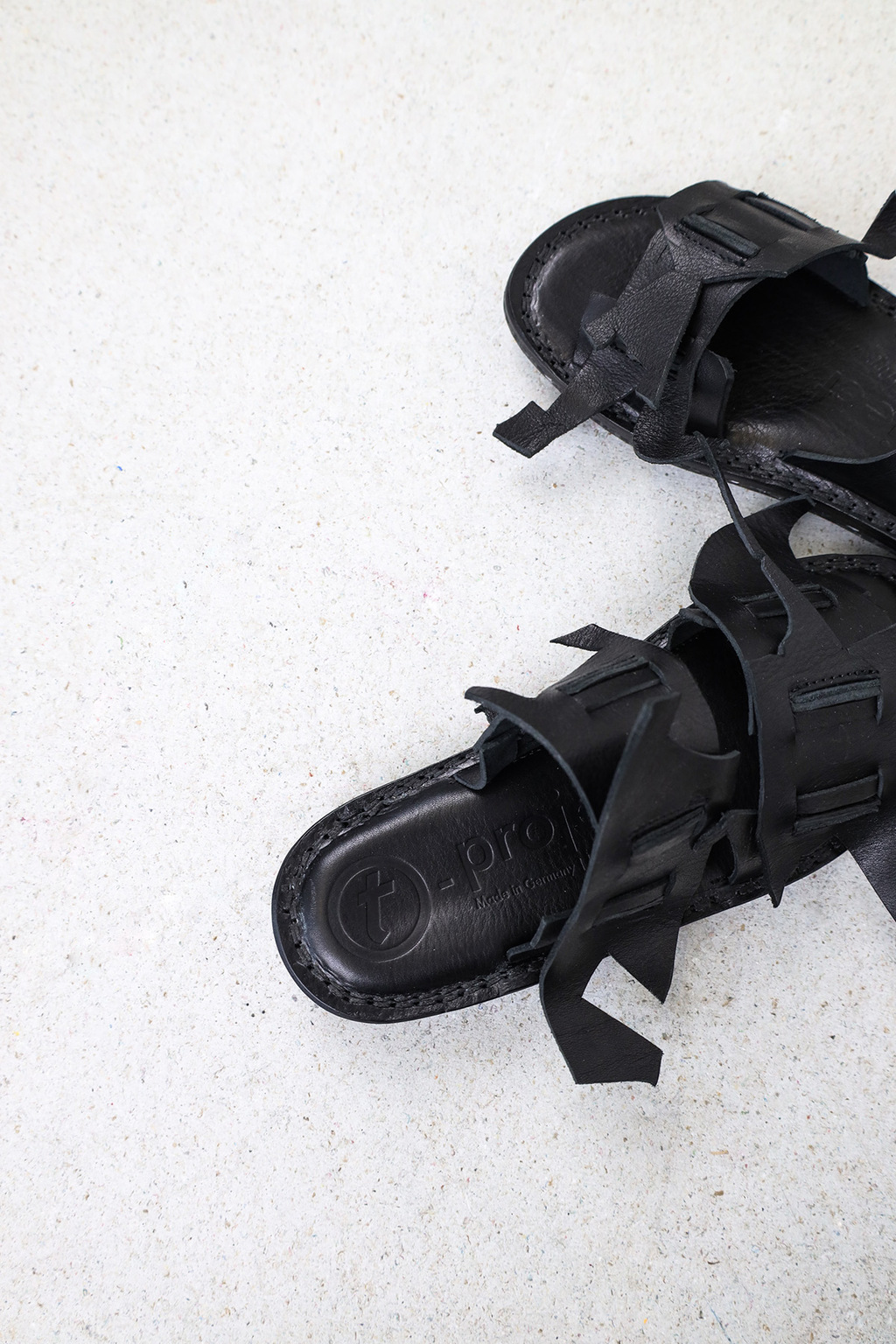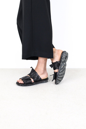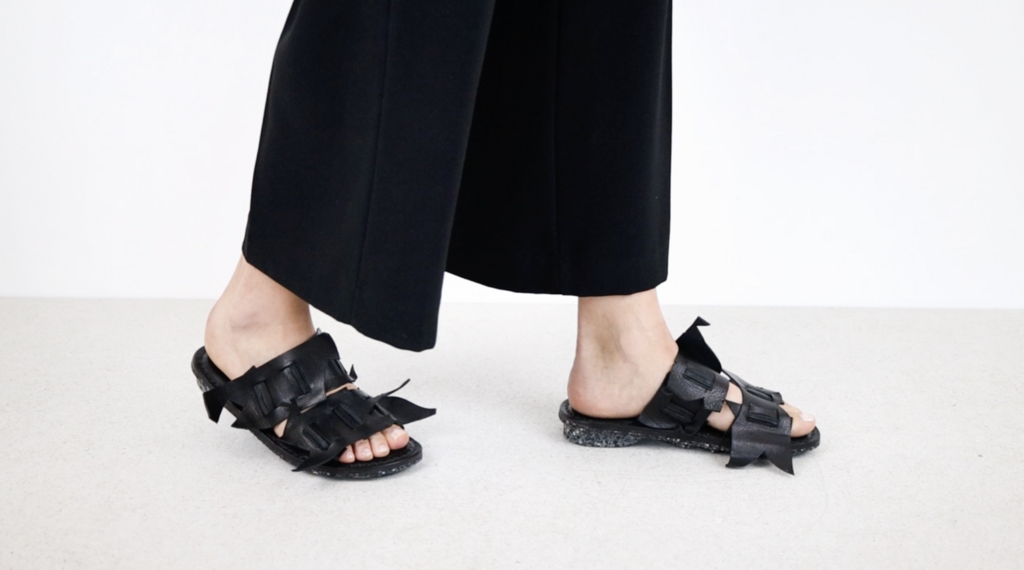 Ein handwerklicher 2-Riemen-Slipper, dessen Bestandteile aus wiederverwendeten Lederresten wie ein Mosaik kunstvoll aus kleinen ineinandergreifenden Stücken geformt und sorgfältig zusammengenäht wurden.