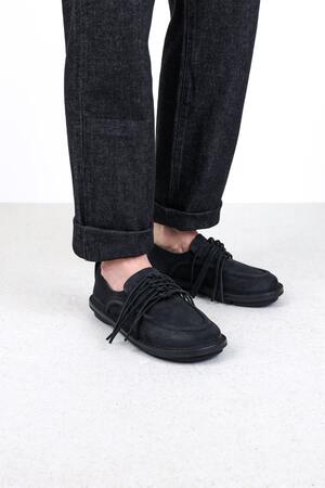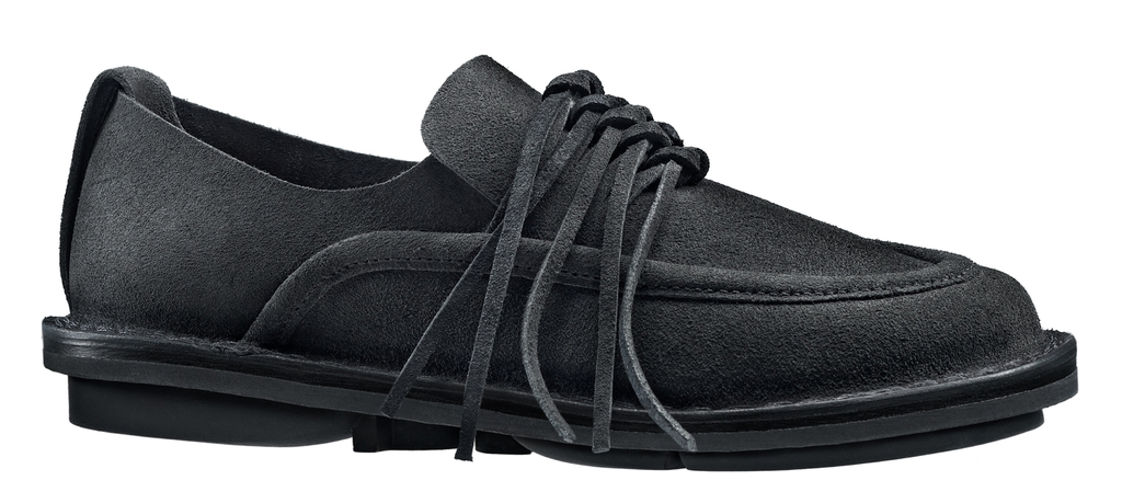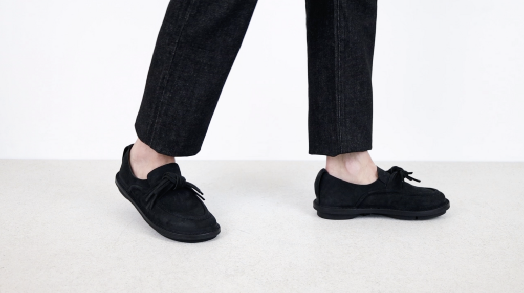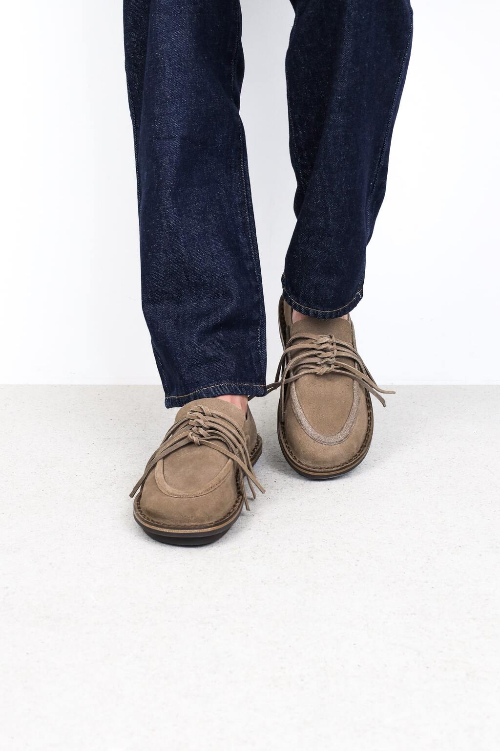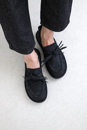 Verspielte Interpretation eines Mokassin mit vielen Knötchen über einem verdeckten Gummizug, der den Fuss hält.