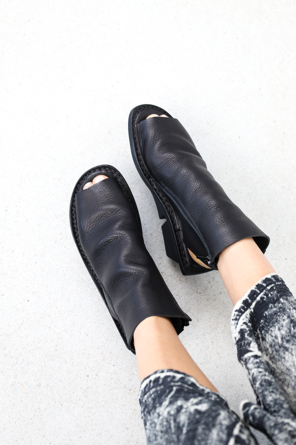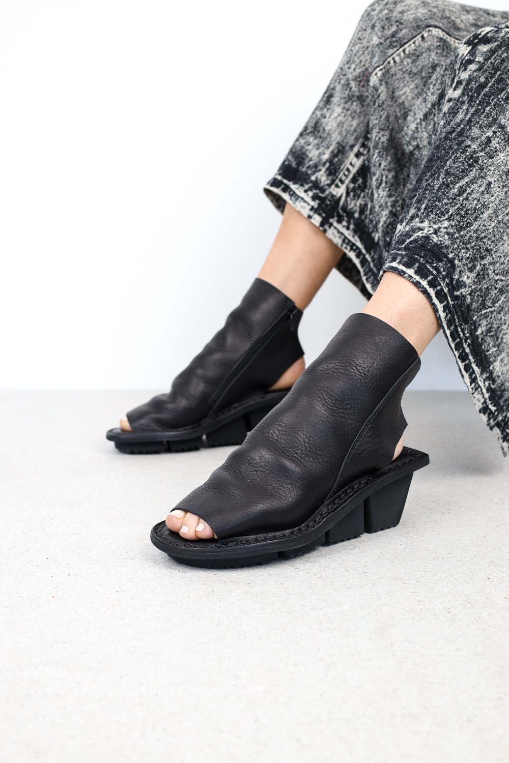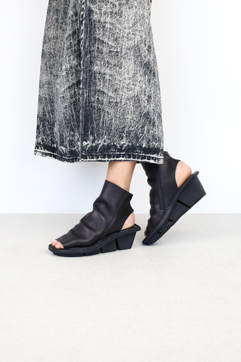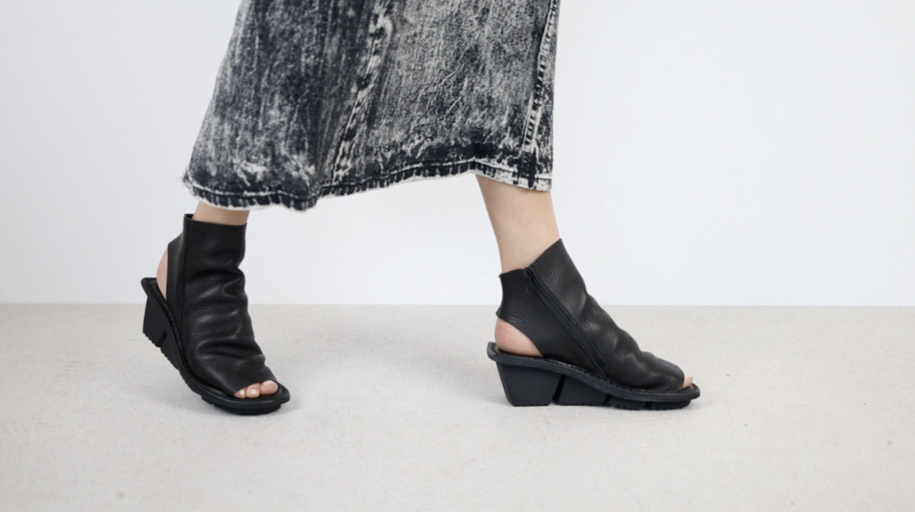Hochgeschlossene Sandale, ungefüttert und mit Reißverschluss innen, deren Schaft sich auf dem Spann in seichte Falten legt.