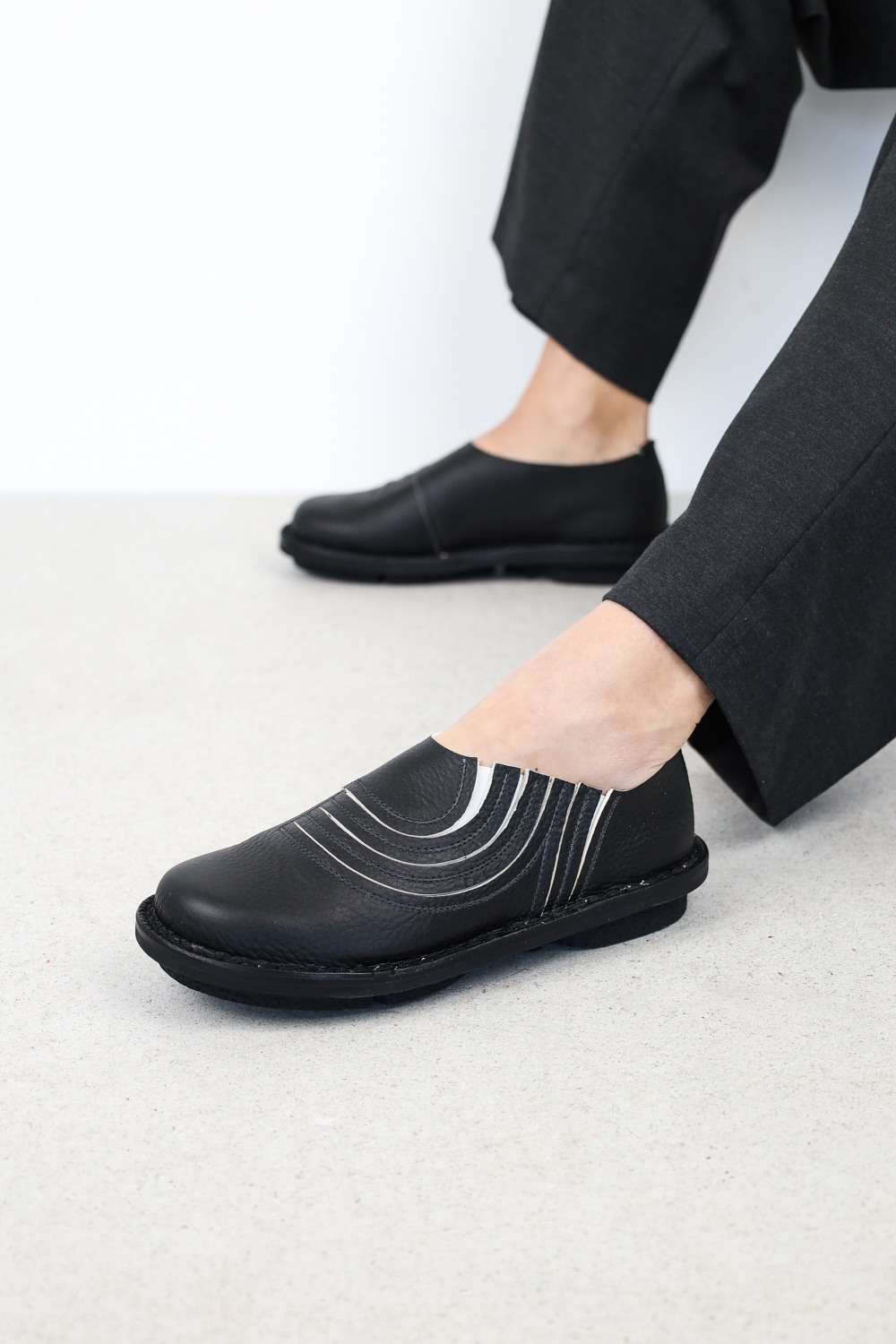 Minimalistischer Alltagsschuh zum Hineinschlüpfen für Sie und Ihn, mit regenbogenförmigen Linien, die sich über einen verborgenen Gummizug fortsetzen.