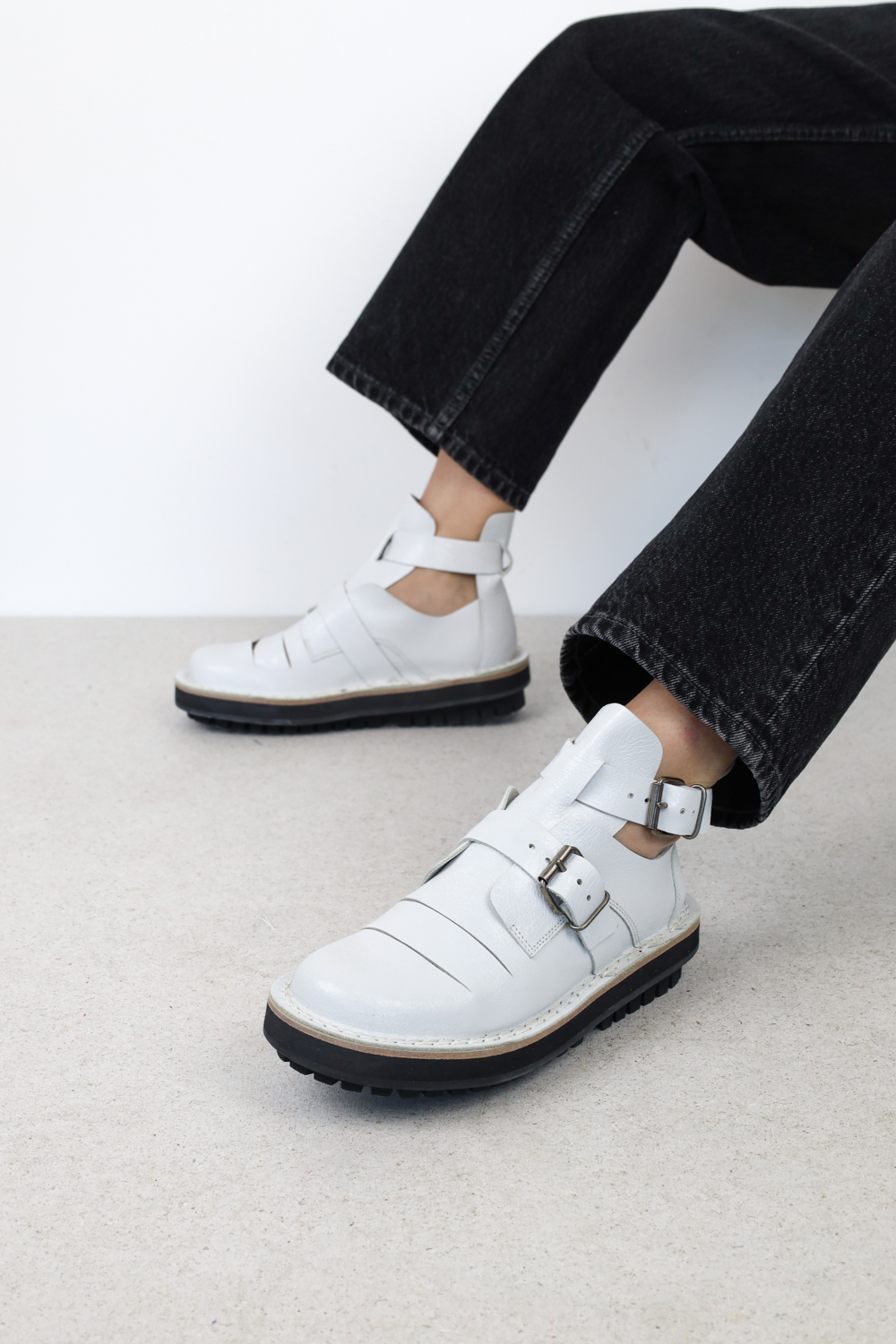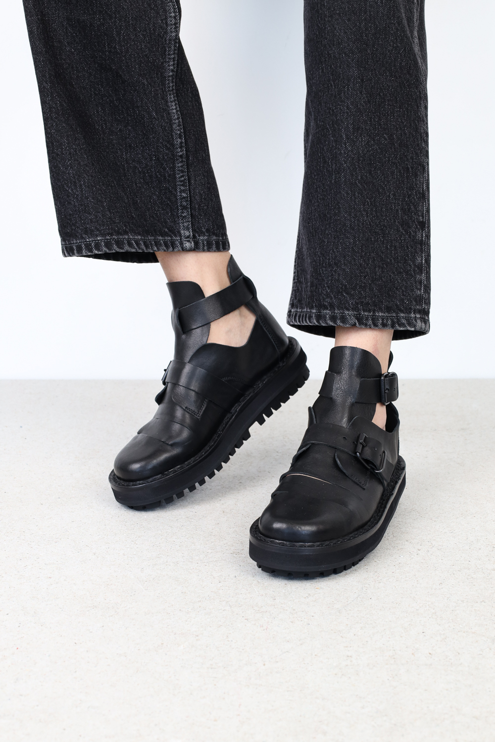 Knöchelhohe robuste Sandale, die hält, was sie verspricht: einen selbstbewussten Auftritt. Die Schlitze im Blatt und die beiden Schnallen, mit denen die Quartiere geschlossen werden, haben etwas Martialisches, das durch die TR Volume-Plateausohle unterstrichen wird.