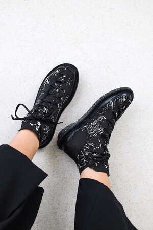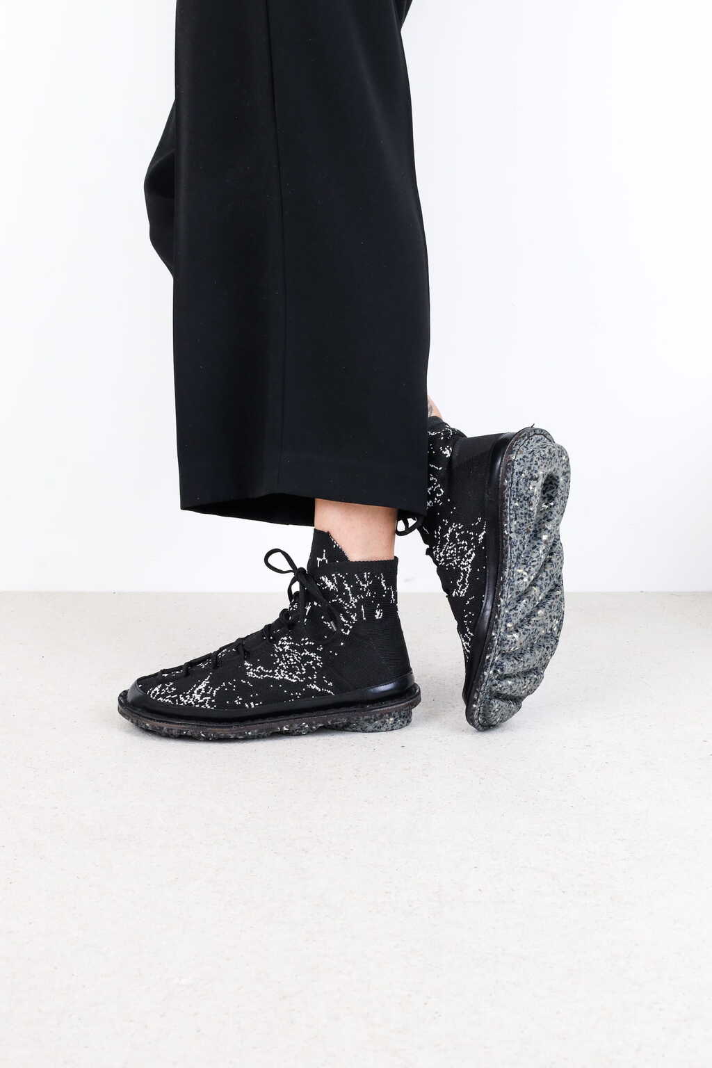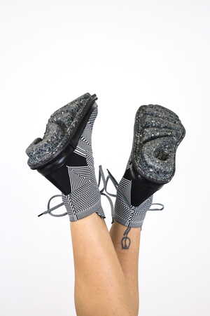 Dieses Garn besteht zu 90 % aus PET-Flaschen und zu 10 % aus Meeresplastik. Textilien aus diesem Garn können vom Hersteller wieder zu gleichwertigem Garn recycelt werden. Der Schuh hat einen Gummirand für verbesserte Haltbarkeit und wird mit unserer Recycling Sohle vollendet. Neben dem schwarz-weißen „seagull“-Muster im geometrischen Design bieten wir nun auch ein neues, wolkig gepunktetes Muster auf schwarzem Grund an.