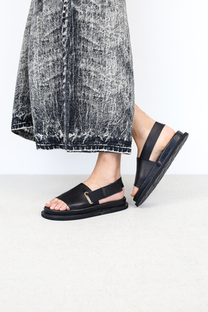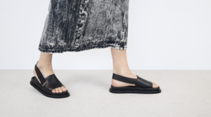 Schlichte Unisex-Sandale mit einem elastischen Fersenriemen, der durch eine Öse geführt wird und mit einem Klettverschluss geschlossen wird.