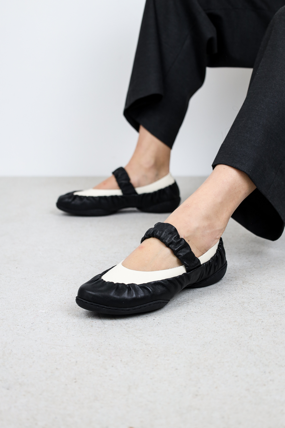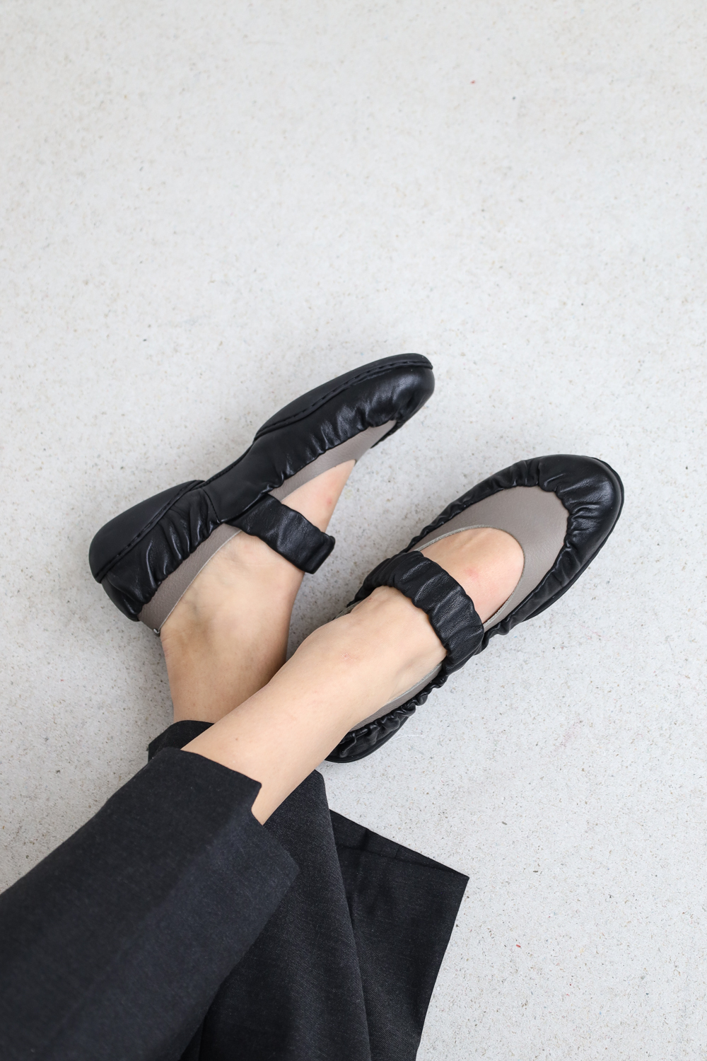 Fein gerafftes Leder spielt bei diesem Ballerina mit klassischen Formen. Ein mit Leder bezogener Gummizug gibt Halt.