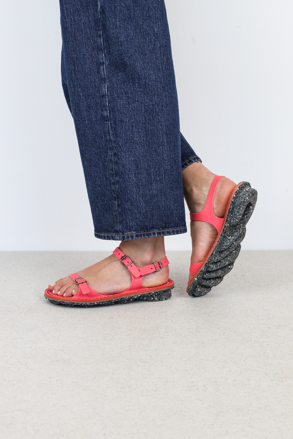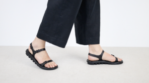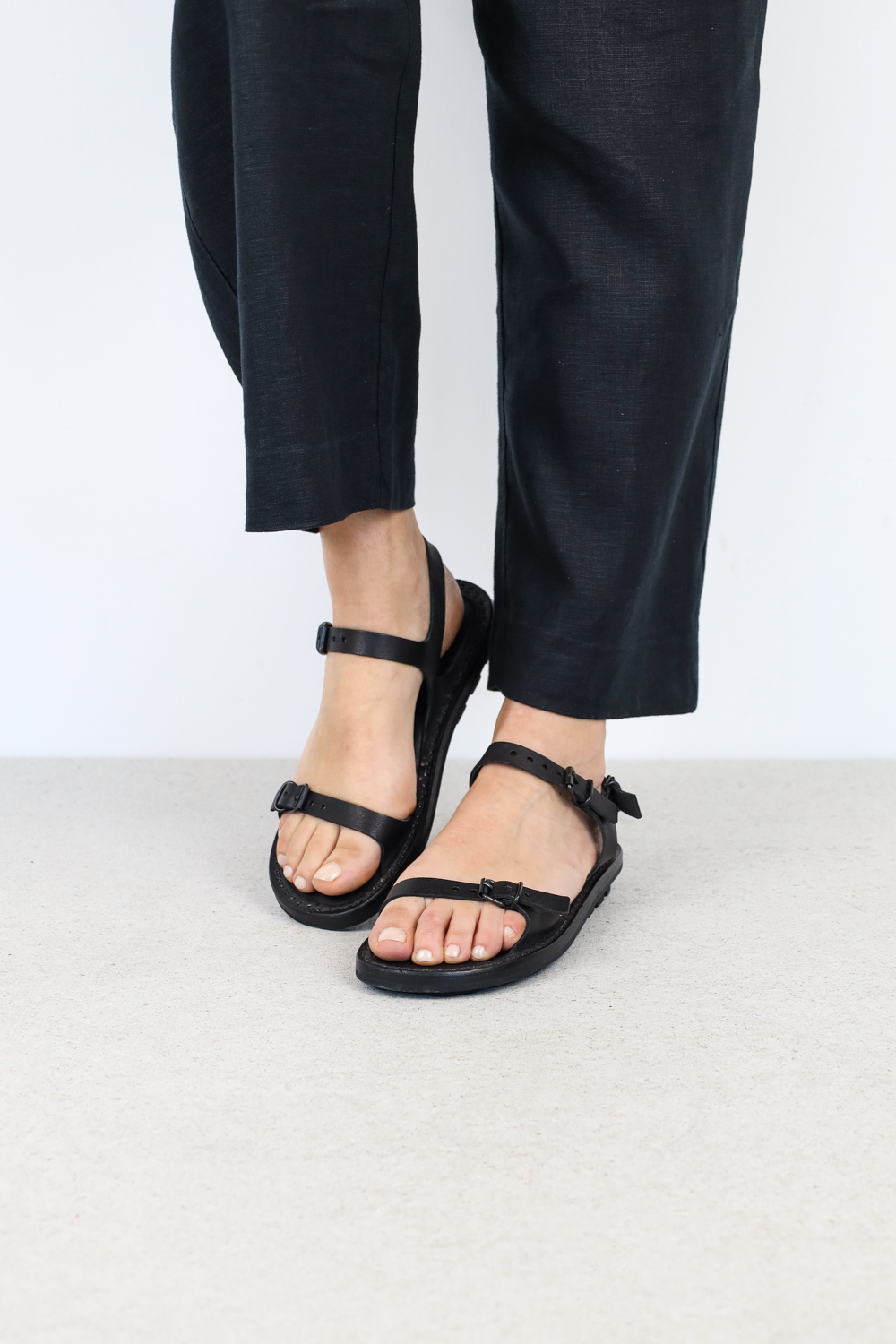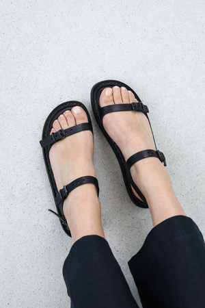 Die minimalistische Sandale ist durch feine Schnallen an Zehen-, Spann- und Fesselriemen individuell verstellbar. Die geschwungene Linie der Riemen wird aus dem zweifarbigen Fußbett entwickelt und erzeugt eine harmonische Optik.