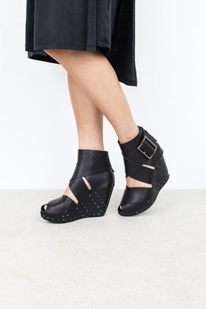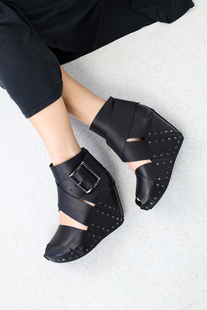 Der in Kooperation mit ESTHER PERBANDT entstandene Holzschuh Soleil ist eine Keilsandale, die aus zwei breiten Riemenkreuzen aufgebaut ist und mit einer breiten Schnalle an der Seite geschlossen wird. Ein zusätzliches Band um die Fessel wird durch einen Reißverschluss an der Ferse unterbrochen.