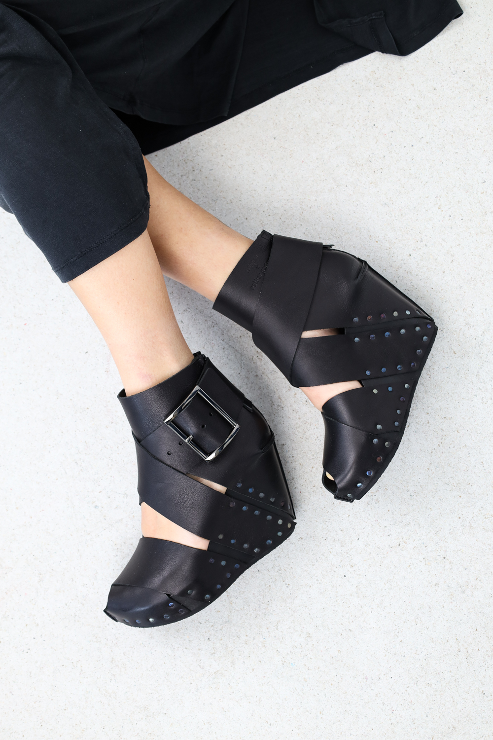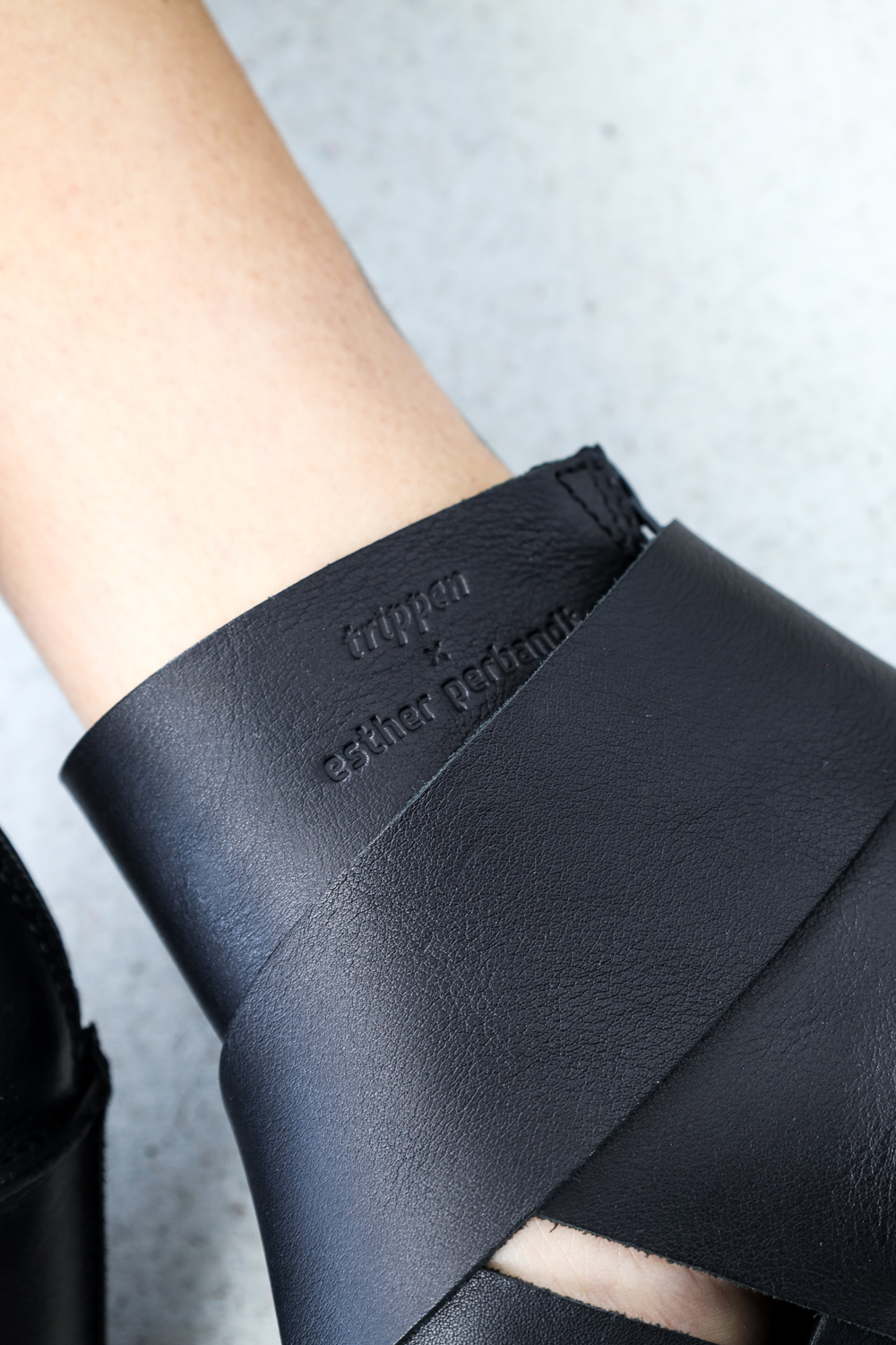 Der in Kooperation mit ESTHER PERBANDT entstandene Holzschuh Soleil ist eine Keilsandale, die aus zwei breiten Riemenkreuzen aufgebaut ist und mit einer breiten Schnalle an der Seite geschlossen wird. Ein zusätzliches Band um die Fessel wird durch einen Reißverschluss an der Ferse unterbrochen. Mehr Infos
