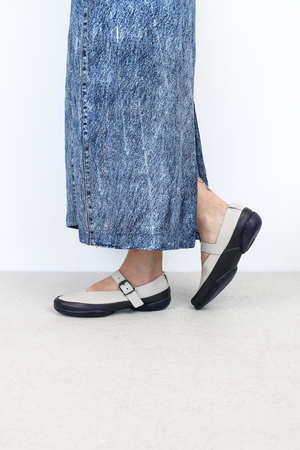 Eine elegante horizontale Linie führt um den ganzen Ballerina. Ein Riemen mit Schnallenverschluss schließt über dem Rist.