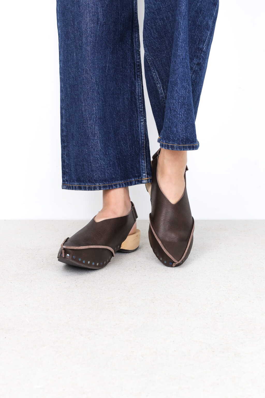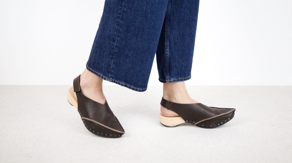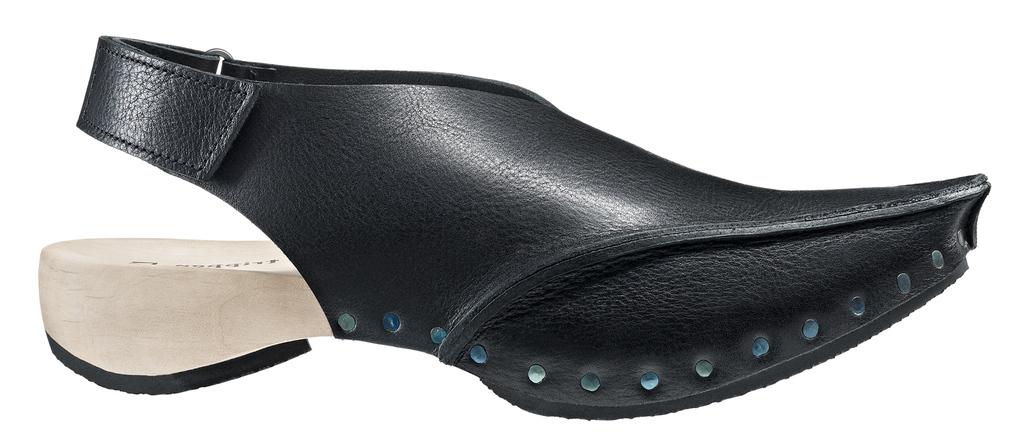 Die markante Spitze dieses Holzclogs wird aus mehreren Nähten modelliert. Um die Ferse gibt ein Klettverschluß-Riemen Halt.