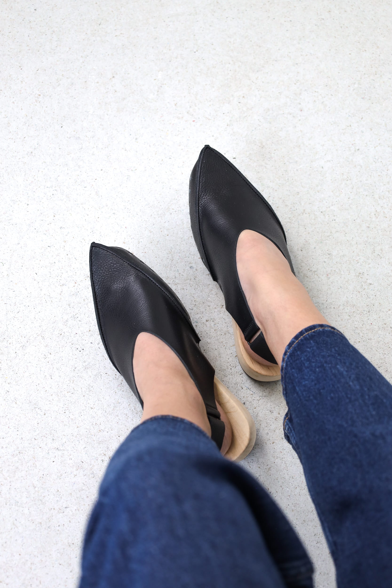 Die markante Spitze dieses Holzclogs wird aus mehreren Nähten modelliert. Um die Ferse gibt ein Klettverschluß-Riemen Halt.