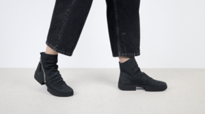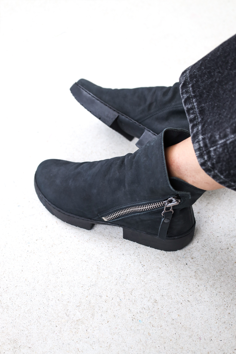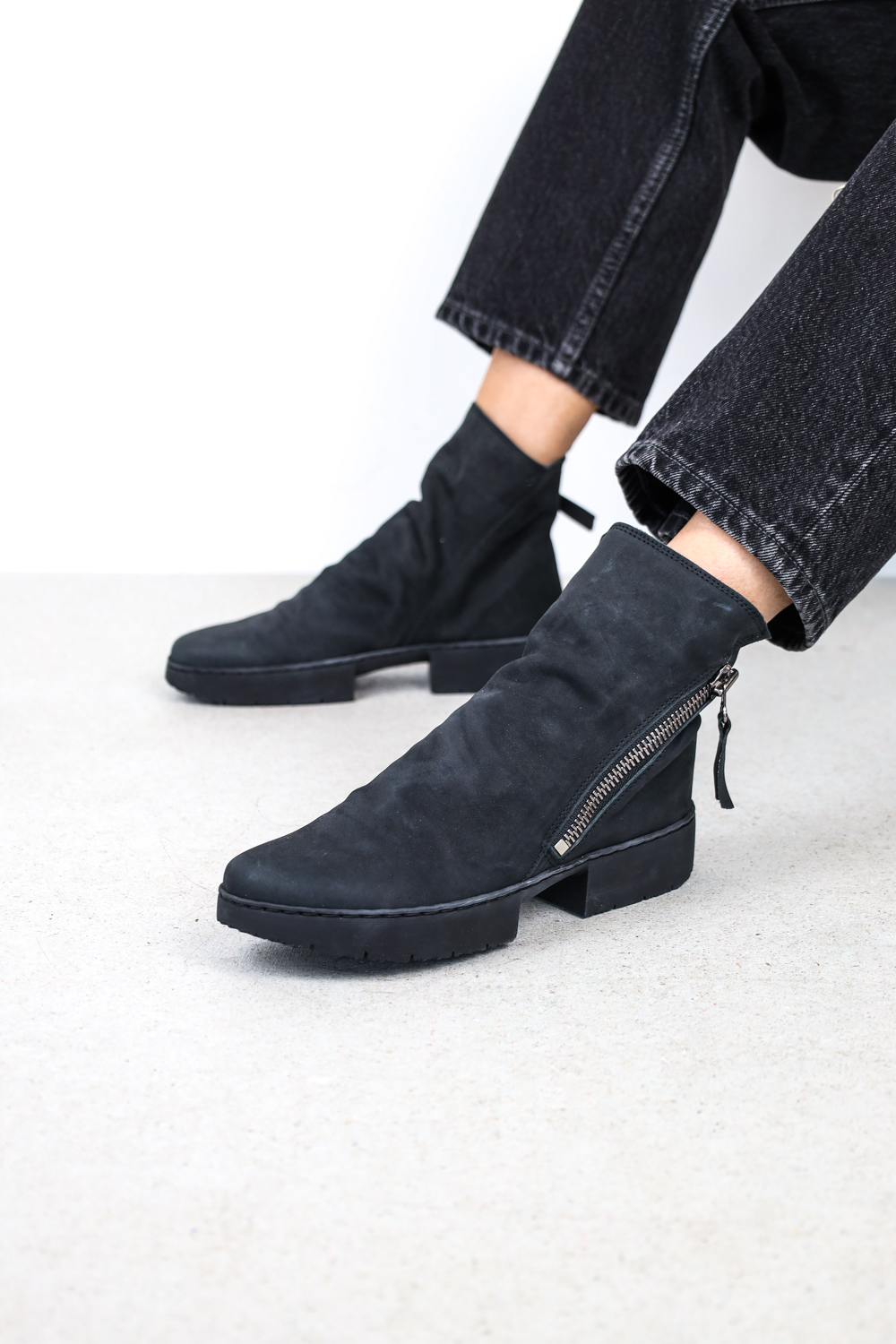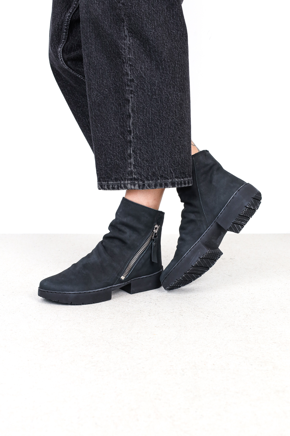 Graphische Unisex-Stiefelette mit breitem Metallreißverschluss außen und leichtem Faltenwurf auf dem Spann.