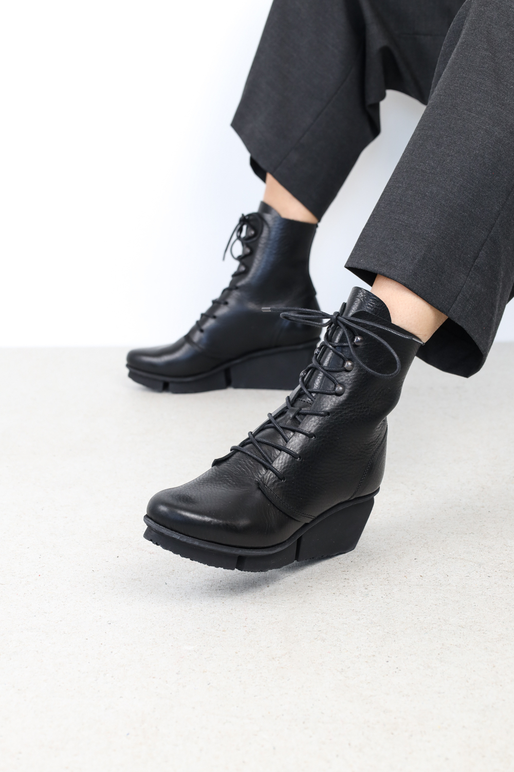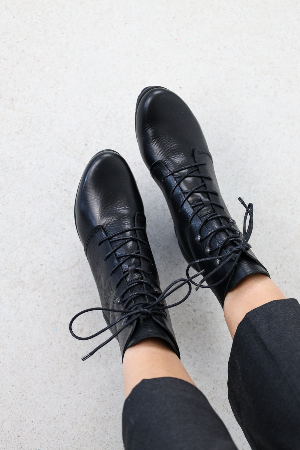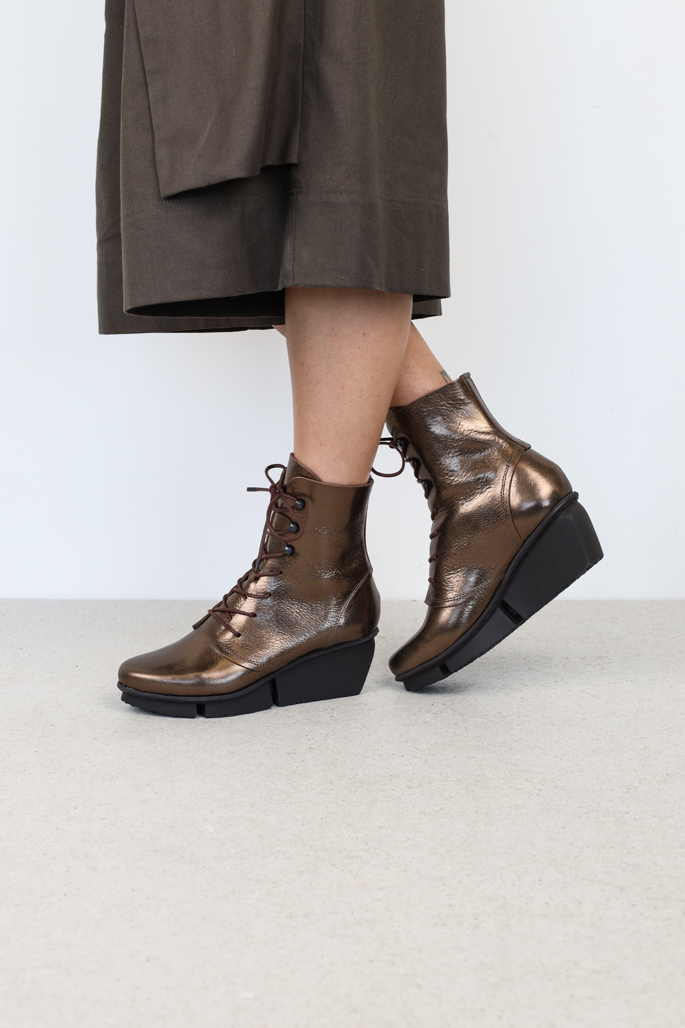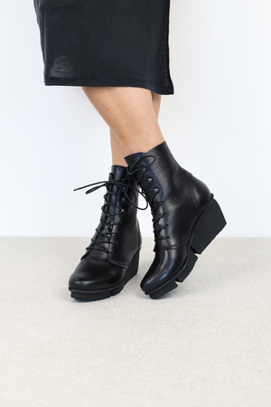 Klassisch, elegante Schnürstiefelette auf der Splitt-Sohle. Die Schnürung verläuft im unteren Teil durch vier Löcher und wird im oberen Teil durch drei Senkelhaken geführt.