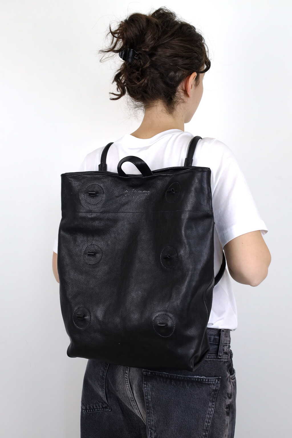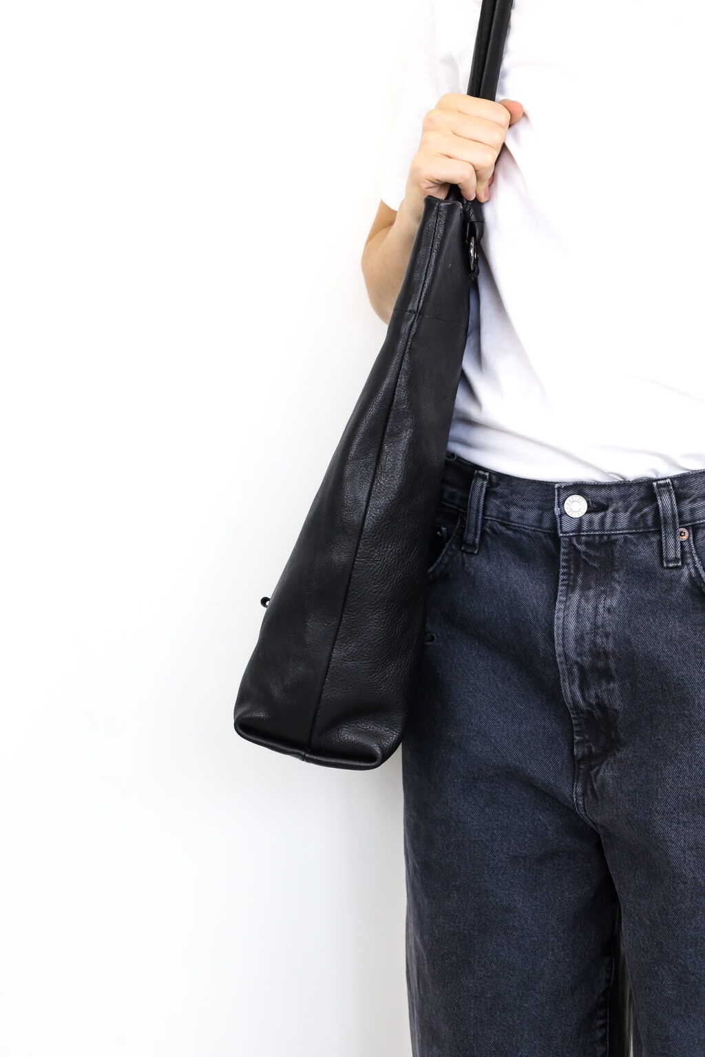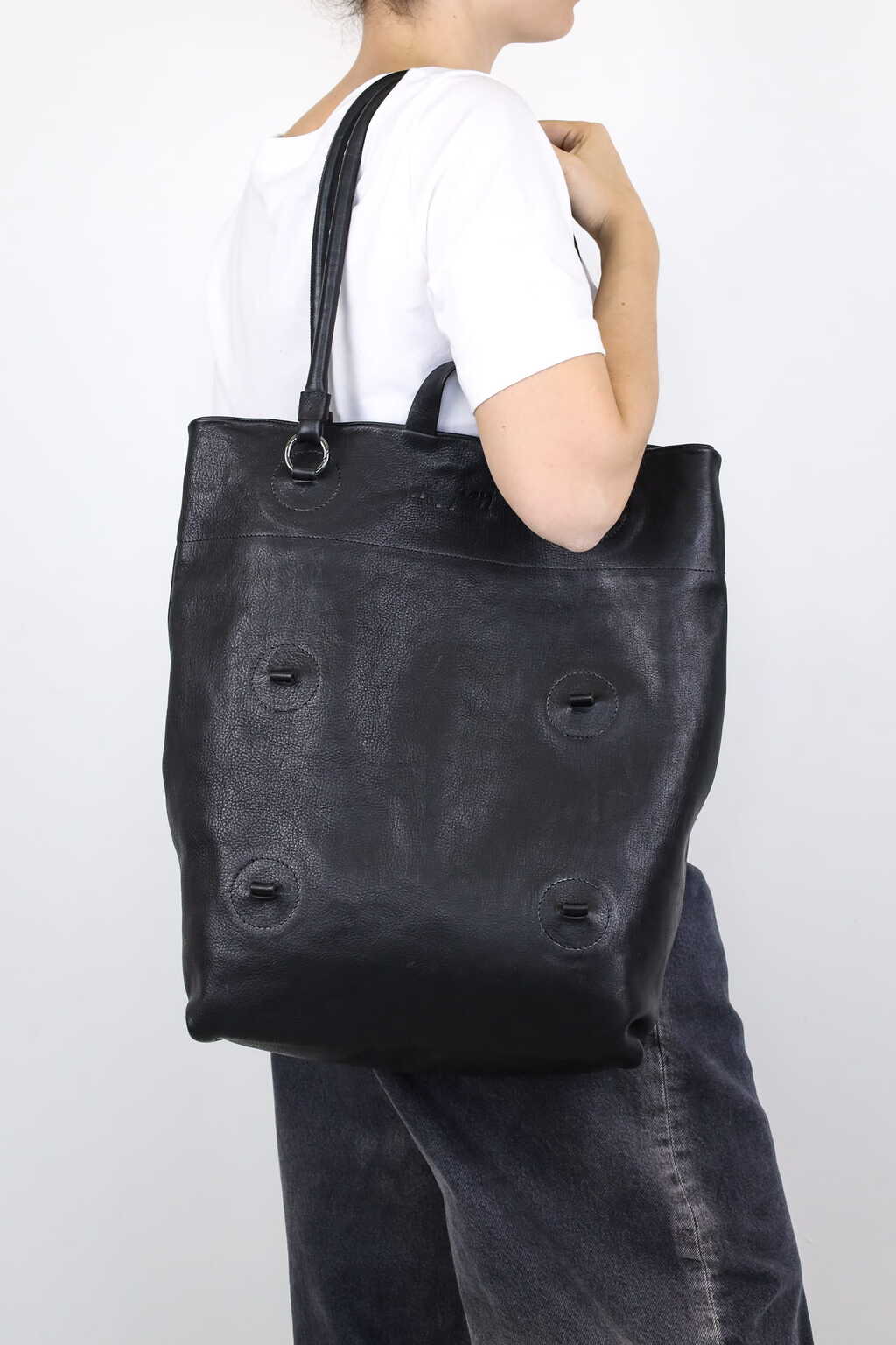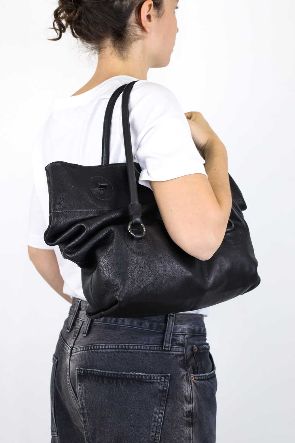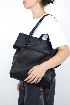 Drei Griffhöhen bieten drei Taschen in einer: eine dekonstruierte, raffinierte Baguette-Tasche, eine mittelgroße Umhängetasche und eine Laptop-Tasche.