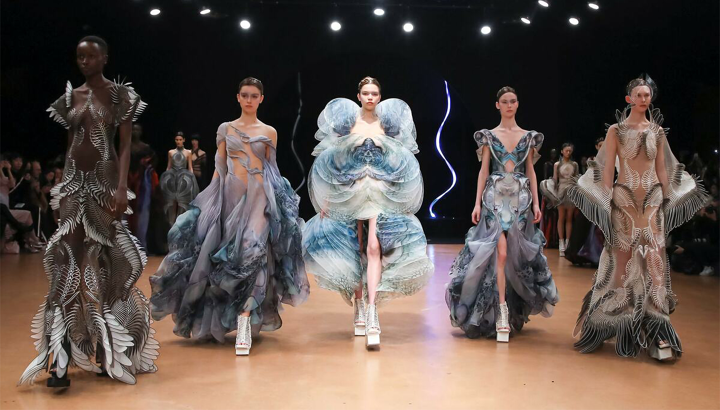Darüber hinaus stellte Van Herpen ihre so genannte "Morphogenesis"-Technik vor, eine Schnitztechnik, die sie in Zusammenarbeit mit dem kanadischen Architekten Philip Beesley entwickelte.
